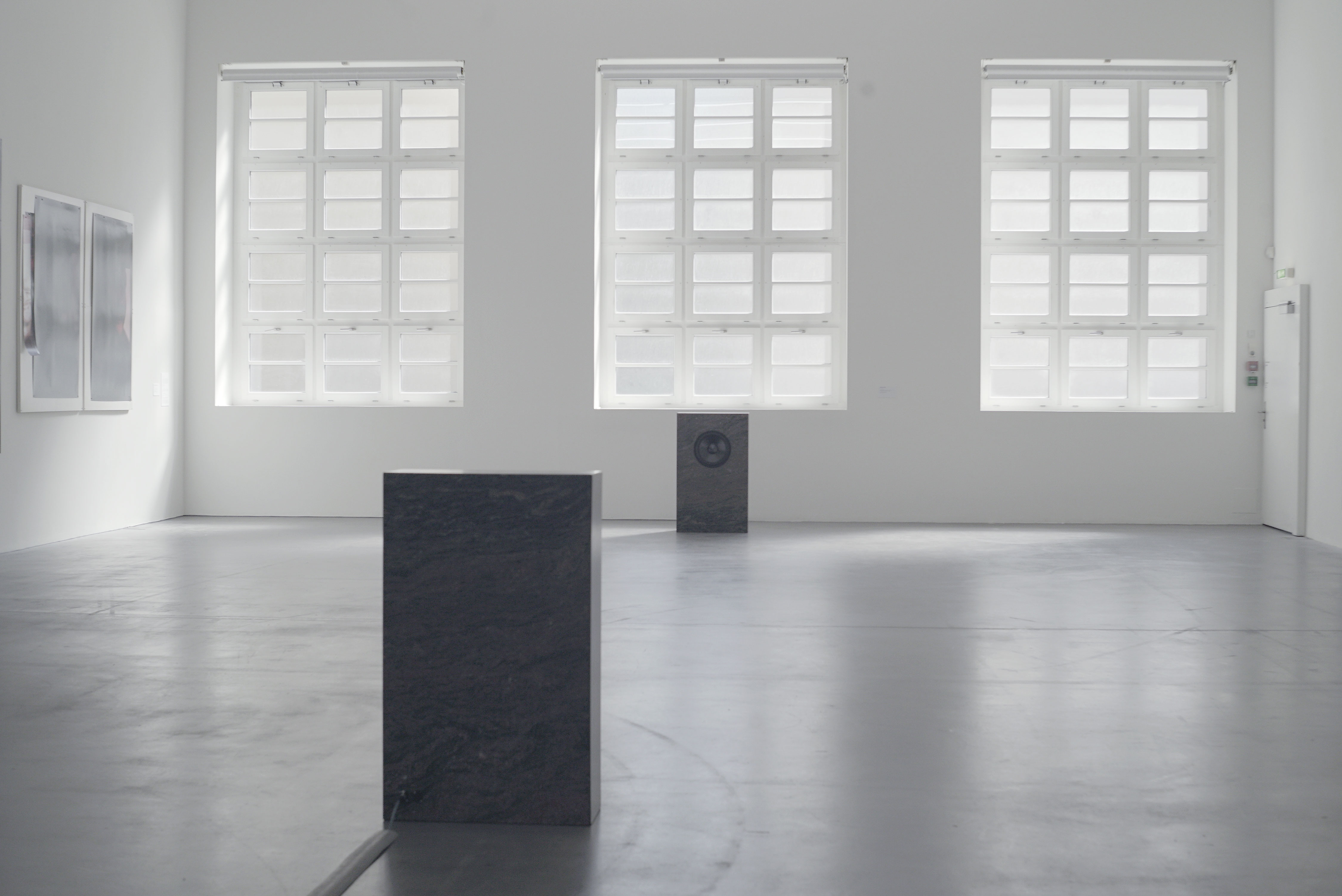 Death and Stone consist of two loudspeakers made from Shangri-La granite which are facing each other and correspond throughout the exhibition space. Formally reminiscent of gravestones, they form two points on a timeline which are activated temporally by the performance Superimpose for which the text sequences and additional singing was overlayered live to accentuate an overlapping moment in time.