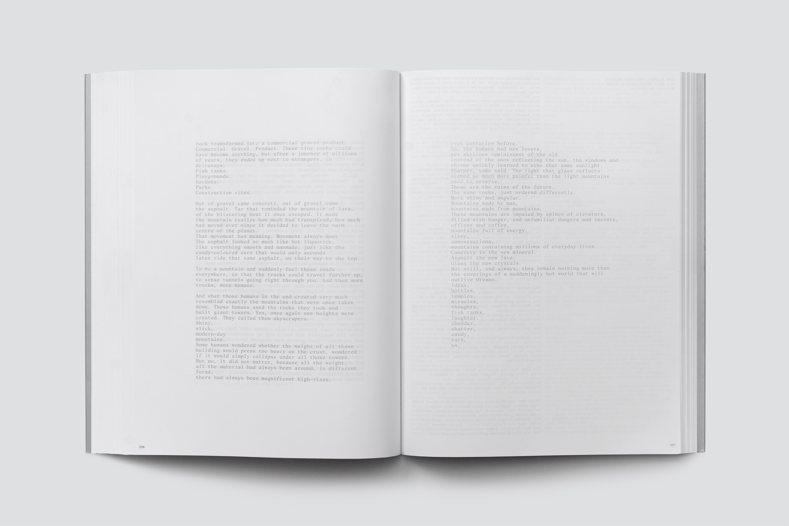 FOR A FISH TANK OR A PARKING LOT examines connections between materials and materialities, architecture and architectural elements—in the real world as well as in models. The book is simultaneously a work of research, collection, and fiction. Keller researches the ecological and cultural significance of gravel and sand, which play a major role in the composition of the earth’s surface, at least in our latitudes, as valuable resources and important components of concrete. A photographic collection of pebbles—printed on almost translucent paper—forms the grid-like, even rigid structure of the book. With a focus on the different shapes and surfaces of the individual stones, the anonymous mass of this basic material of our built environment dissolves into countless individuals. Gravel is extracted from the earth, taken out of pits and rivers, and simultaneously grows upward in new formations as a component of concrete. In this way, Keller designs visual fictions specifically for this publication made of gravel. They are bold architectures, ruins of the future, and in some cases dystopian landscapes. Printed on transparent film and distributed throughout the book, these images humorously address the effects of human action such as the consumption of resources and our modern-day impact on the environment.