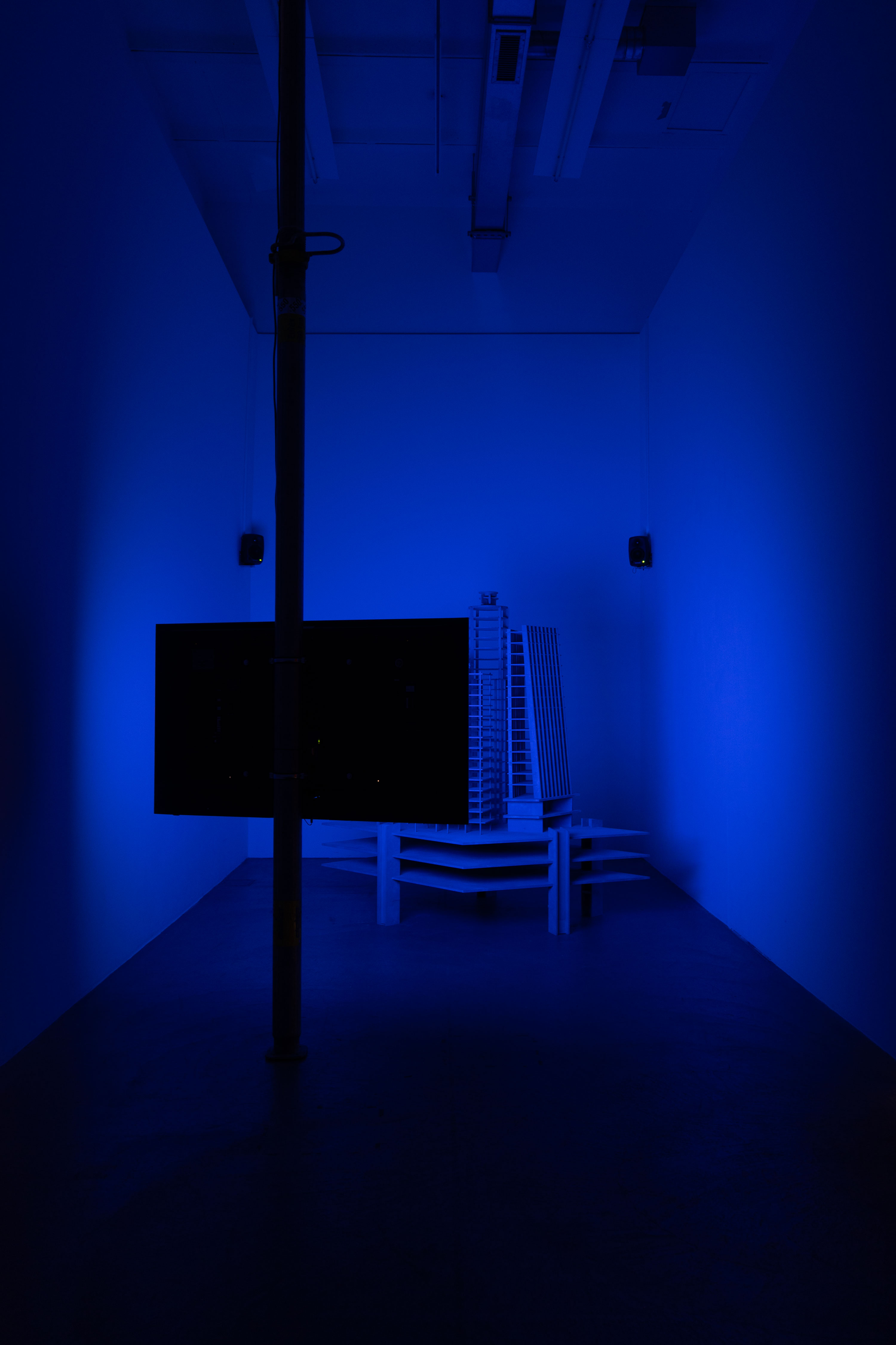 The glow of the screen casts an eerie light on a model-like, sculptural arrangement. A group of building skeletons forms a ghostly city. Formations of power and possession are striving upwards in a concentrated force in a confined space, with abysses and empty pits in between. Gradients that reflect the growing system of our time. In a short film excerpt, dust covers urban centers in mist, spreads insidiously and settles as deposits.