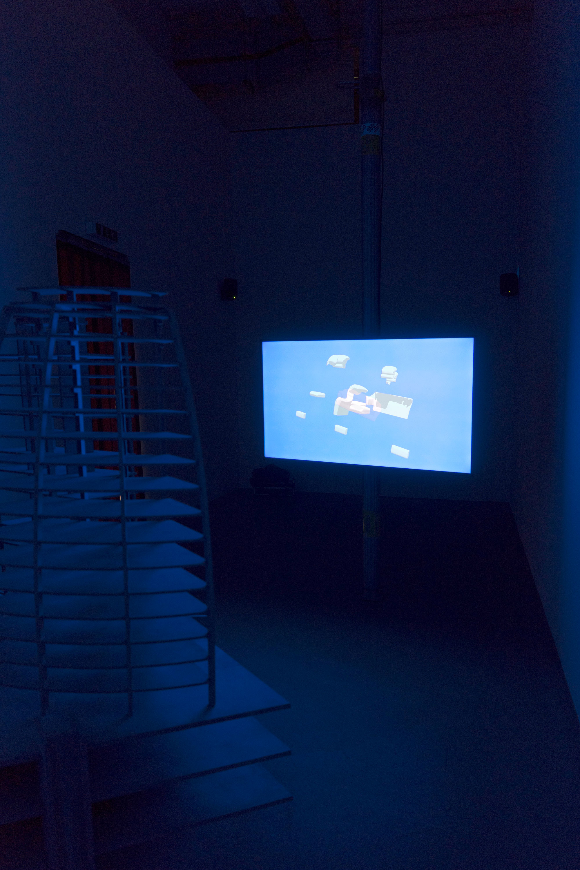In the work Looping Suspense, human interventions in nature are placed in a field of tension with the built environment and made atmospherically perceptible in a spatial arrangement. Set pieces of found media images of detonations in limestone quarries, in which material is mined for concrete production, as well as collapsing high-rise buildings, which have to make way for the construction of new buildings through blasting, are interrupted by digitally generated animations. In explosion-graphic representations, isolated pieces of furniture dissolve into their components and spread out. The effects of global trade and consumption are symbolically illustrated in the decomposition of these objects.