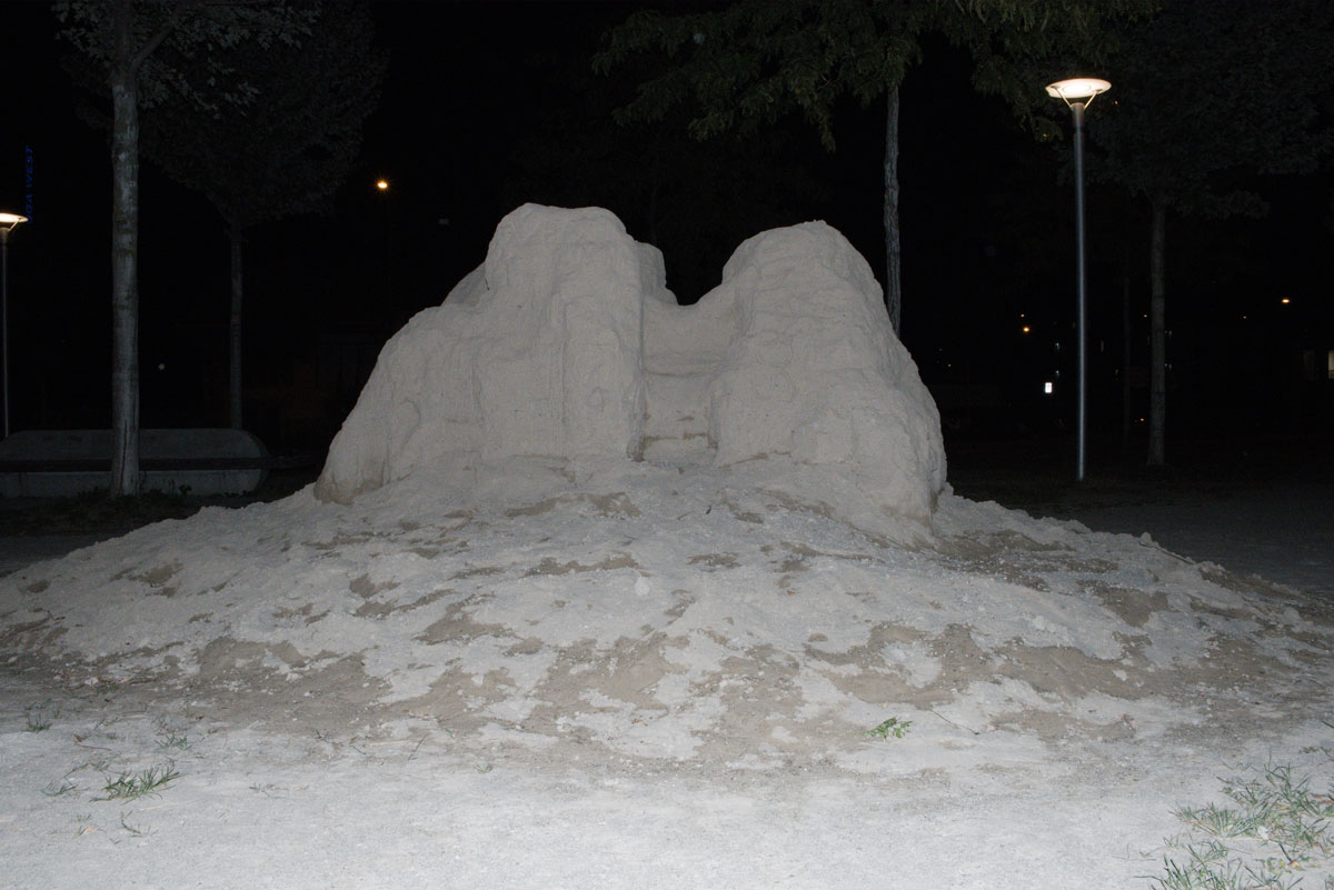 Shaped in pressed sand into a monumental, architectural form, the construction mor- phs in constant interaction with its environment, with mechanic and climatic forces that act with it. It stands emblematically for the power of the public and the ecosystem to take over and transform what has solidified and responds in that sense to the current discussions around mundane histories and how they are remembered in monuments. The selection of images shows different stages documented during the process by a photo trap camera, the security agency responsible to monitor the works of the festival, and other individuals that took pictures of the work.