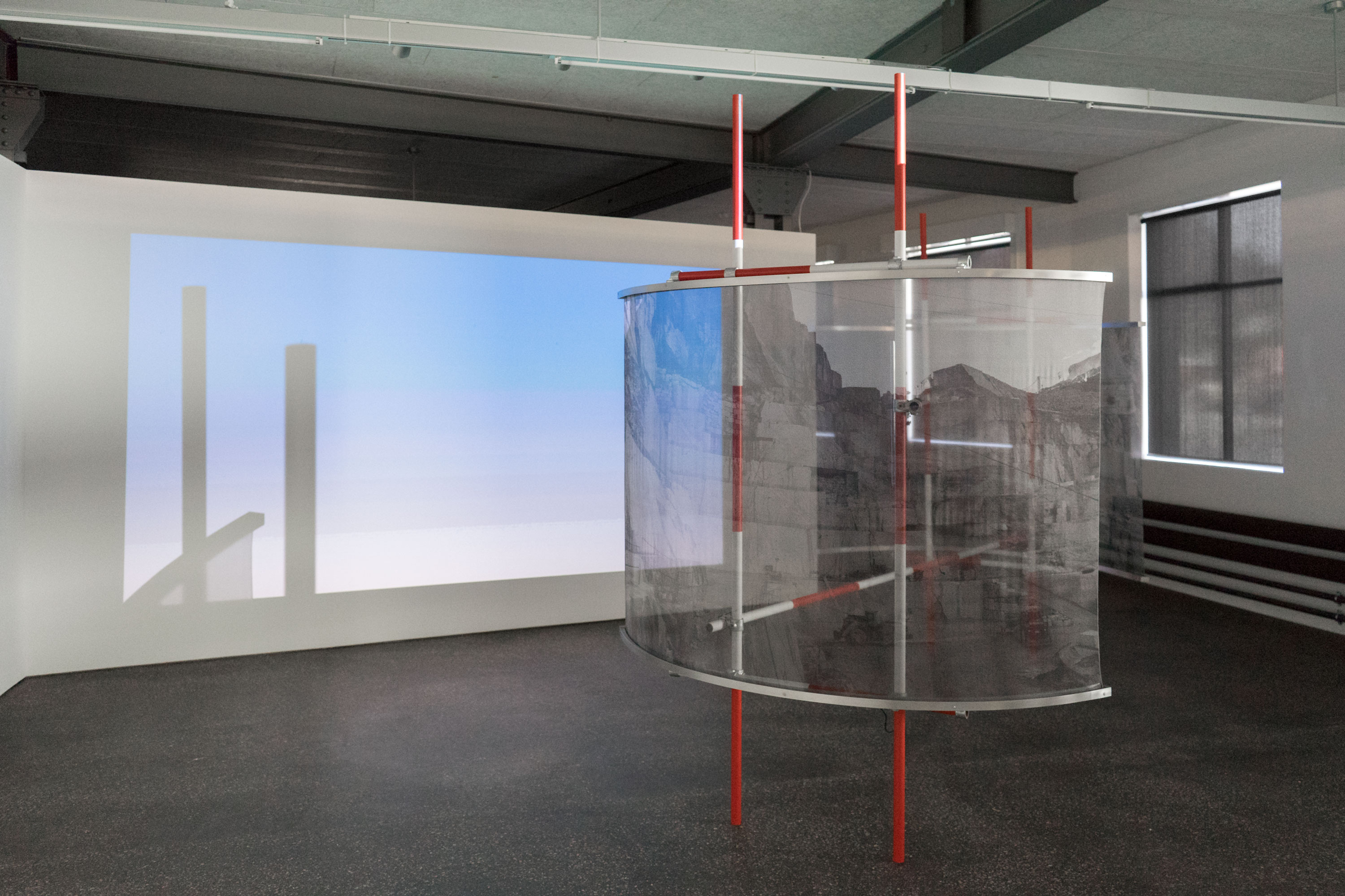 The installation follows mineral traces and explores the question of what remains of a mountain after the intensive extraction of rock. The work is based on video and image recordings from the Carrara quarries in Italy. Stone dust particles in the air after darkening become visible through the sensitivity of the camera and reveal a kind of ghostly remnant of the quarried mountains.