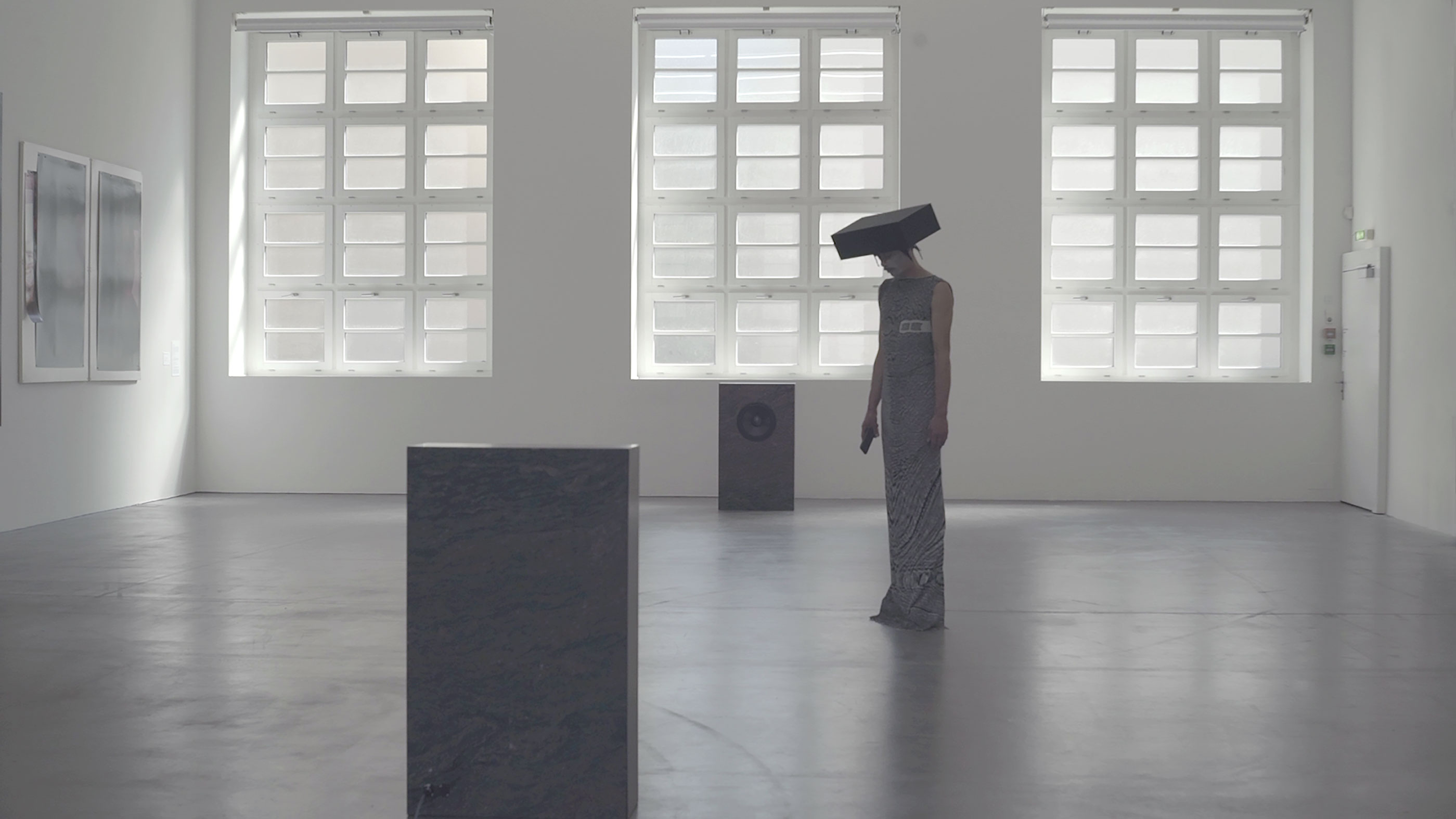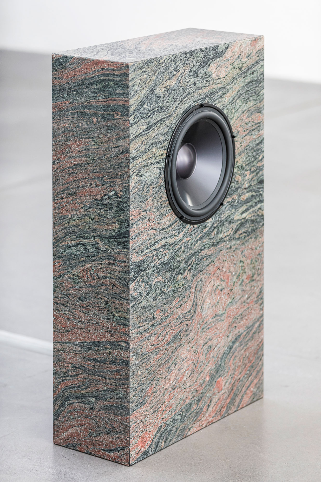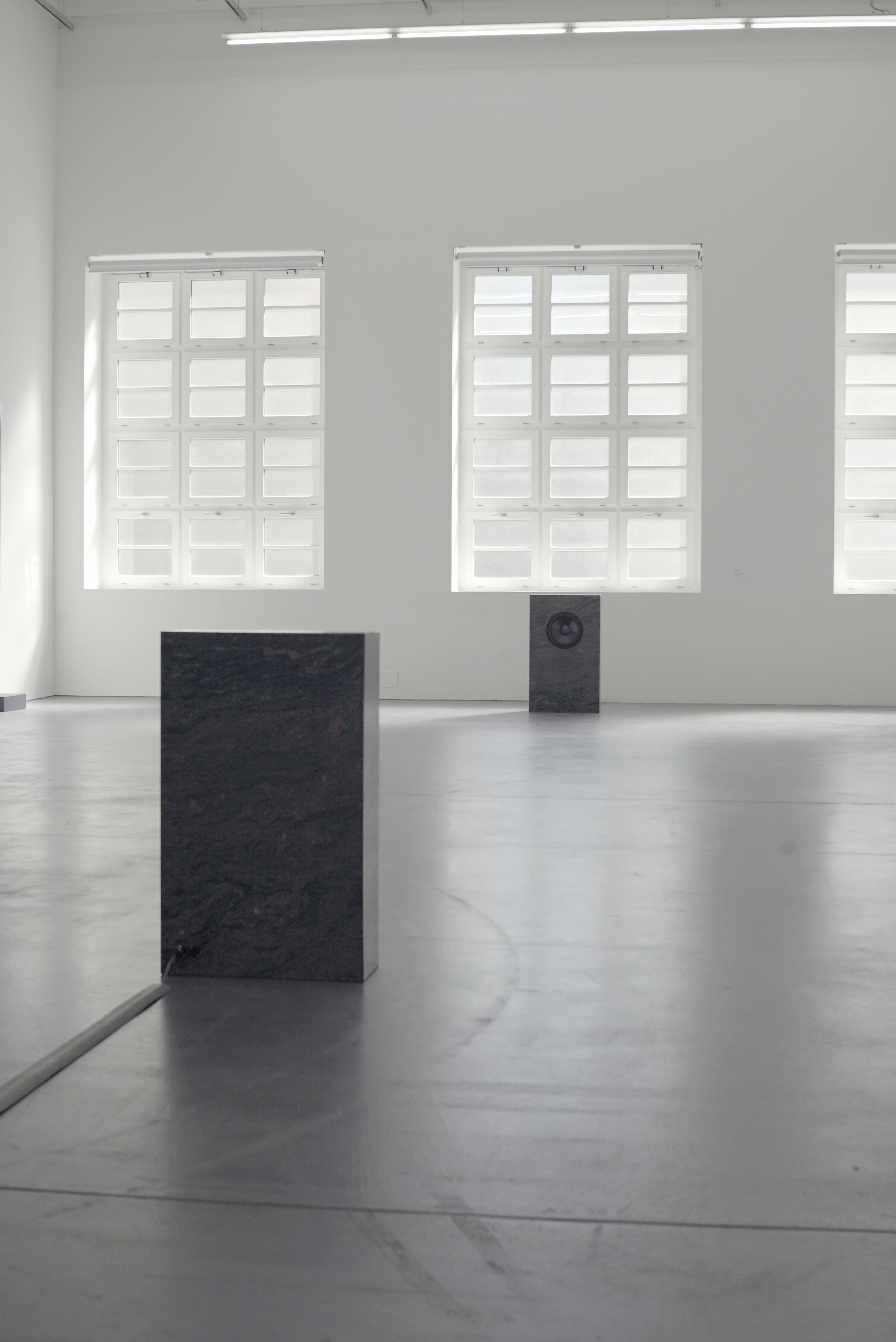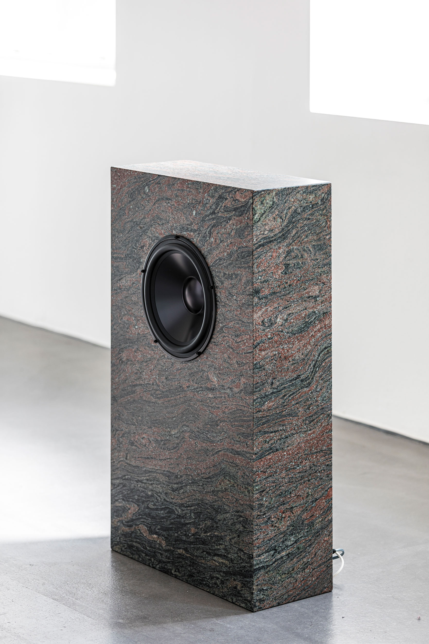 Death and Stone consist of two loudspeakers made from Shangri-La granite which are facing each other and correspond throughout the exhibition space. Formally reminiscent of gravestones, they form two points on a timeline which are activated temporally by the performance Superimpose for which the text sequences and additional singing was overlayered live to accentuate an overlapping moment in time.