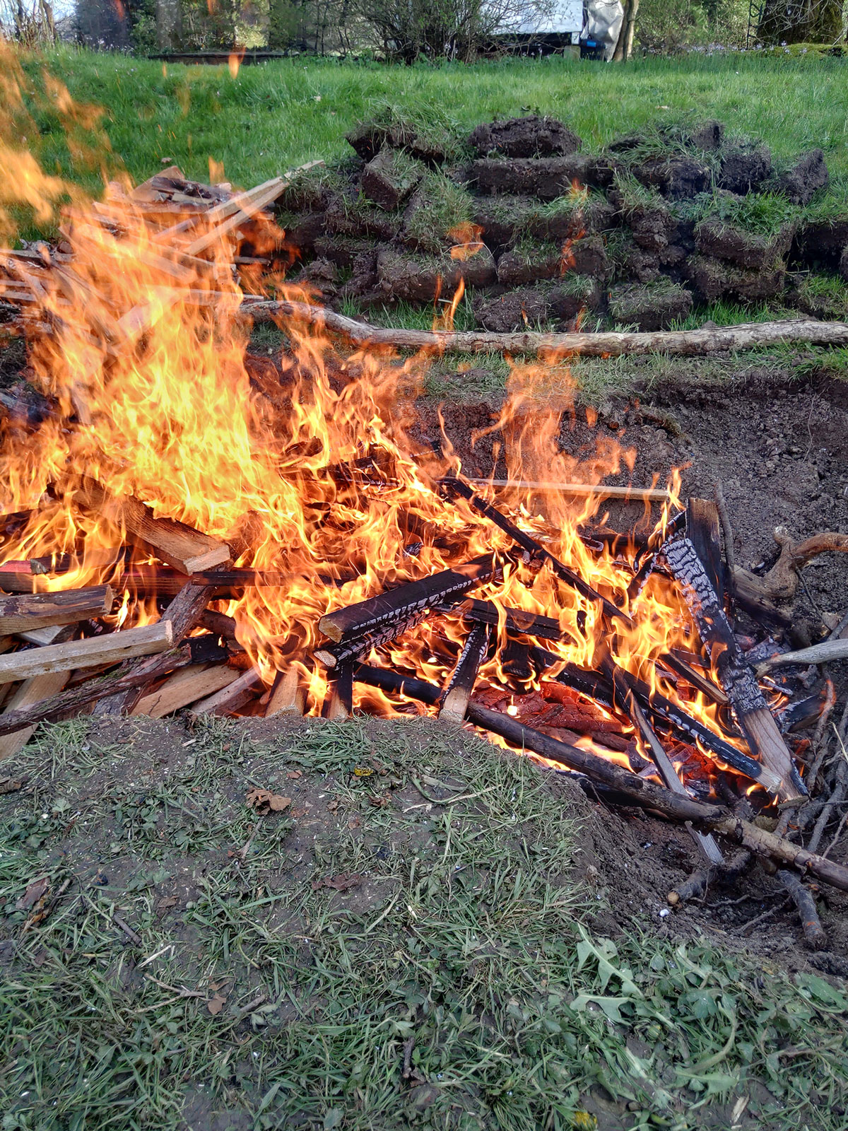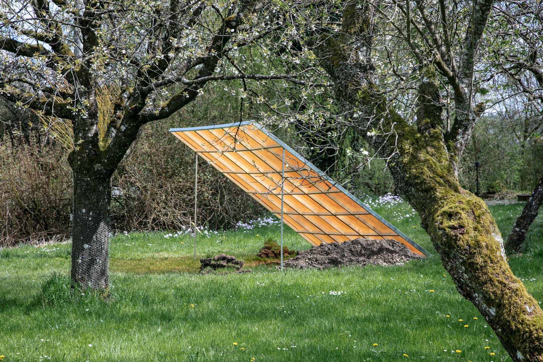 Ceramic objects were moulded from local earth out of the very pit where they were fired afterwards in a traditional field firing technique. The pieces have small notches and ornamental patterns on their surface, reminiscent of scales or individual vertebrae, of fossilised plants or even the tip of an arrow. The arrangement remained untouched after the process and is presented as an excavation, covered and protected by a grid structure that references archeological measuring instruments. The orange roof creates an artificial atmosphere on the scene,