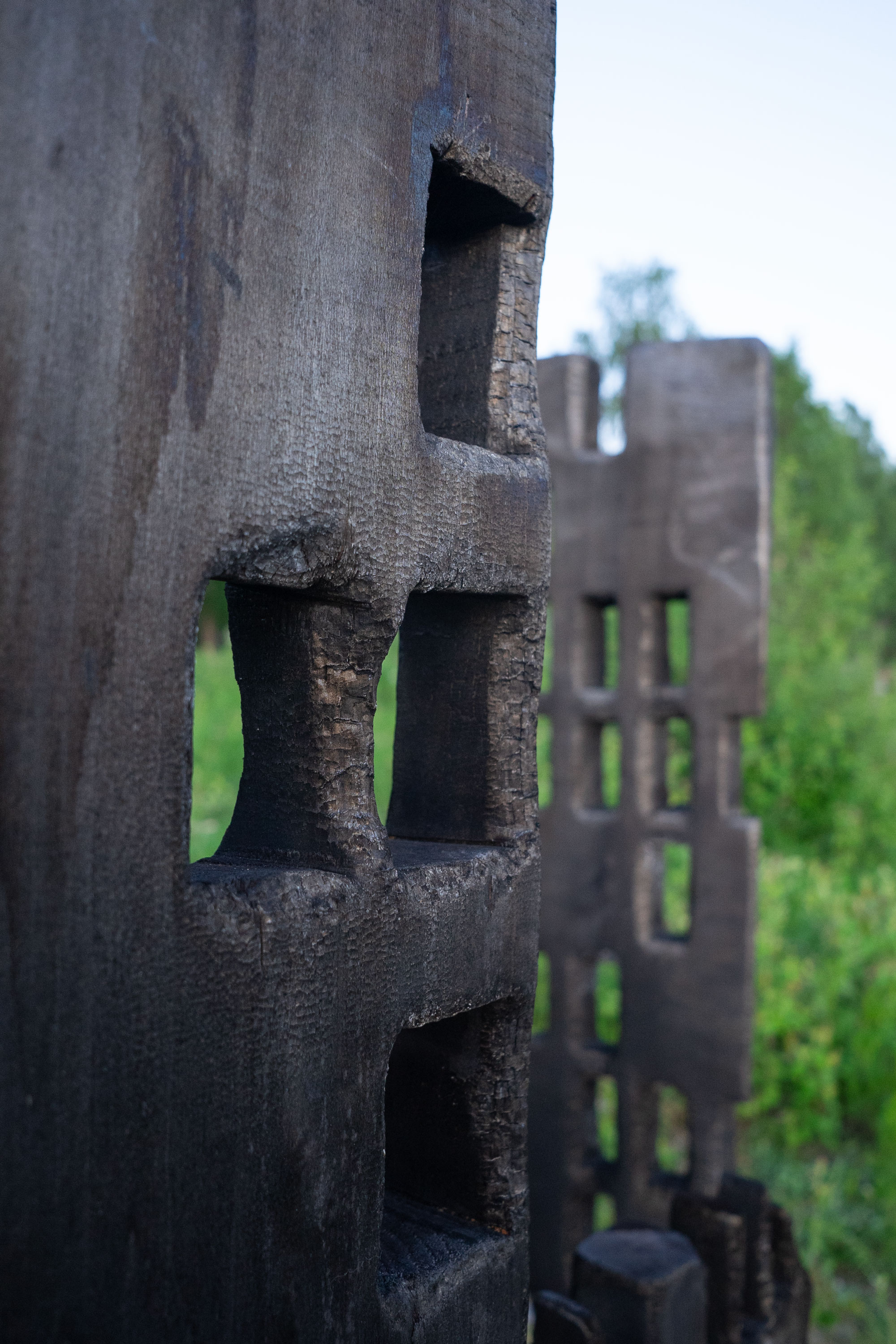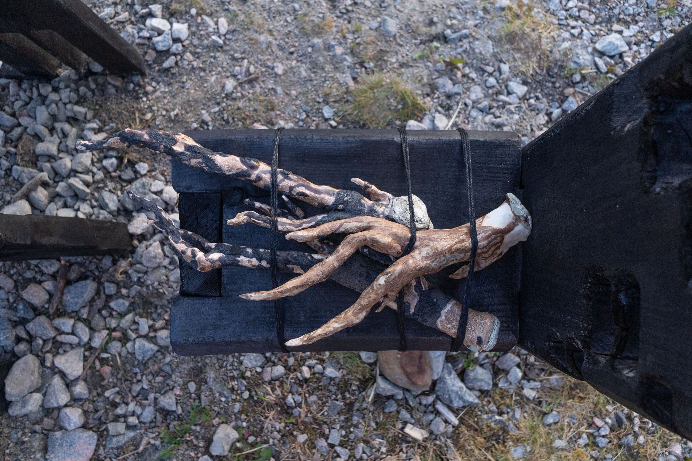 Placed on burned wooden chairs which outline architectural structures in ruins, the roots symbolize the connection to the grounds, ancient knowledge and the invisible thereby juxtapose to the sky-scraping anthropocentric ambition to govern and control earth.