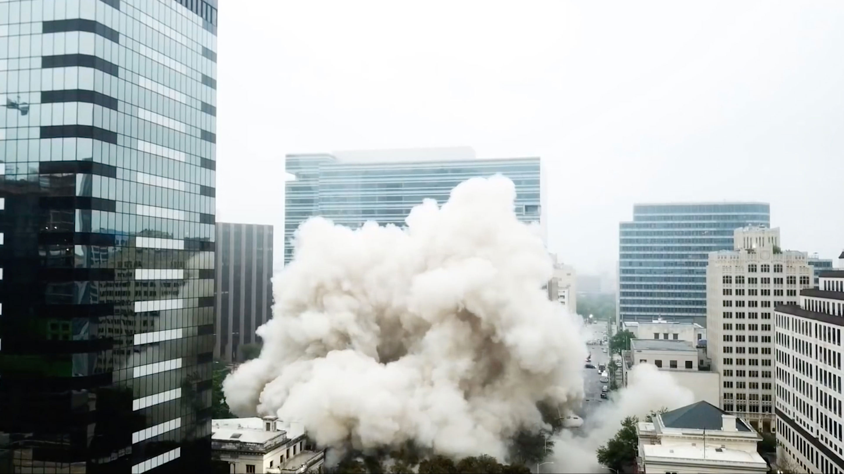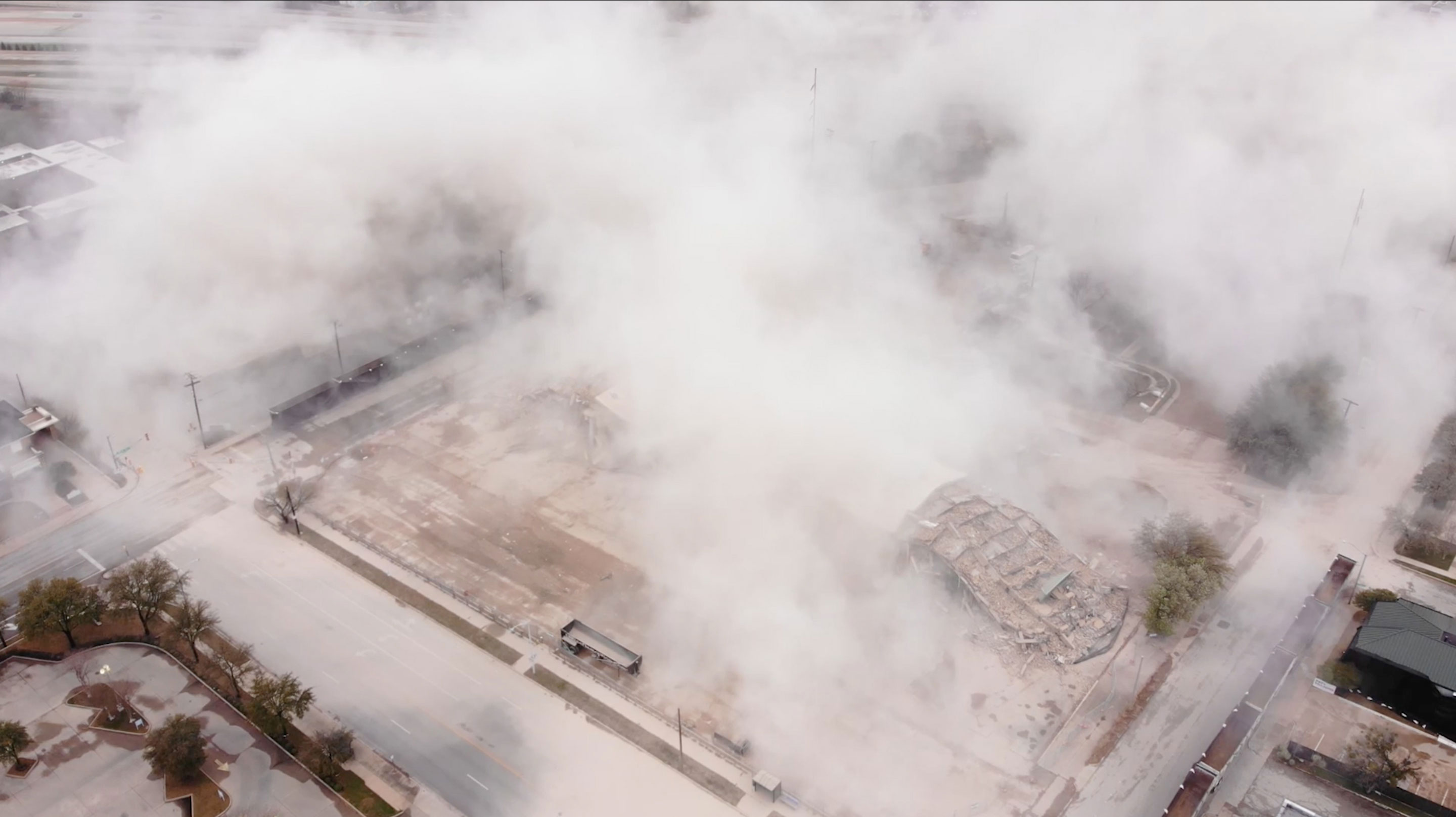The glow of the screen casts an eerie light on a model-like, sculptural arrangement. A group of building skeletons forms a ghostly city. Formations of power and possession are striving upwards in a concentrated force in a confined space, with abysses and empty pits in between. Gradients that reflect the growing system of our time. In a short film excerpt, dust covers urban centers in mist, spreads insidiously and settles as deposits.