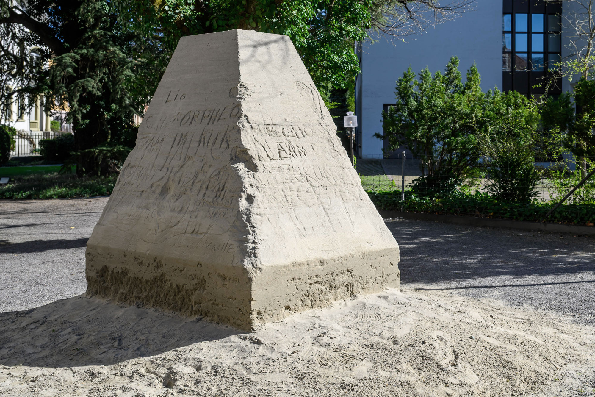 Derived from the shape of the anti-tank obstacle, the geometrical volume of pressed sand changes with the influences of its environment over time. Traces of human and meteorological impacts amplify the decay and put their temporality of these concrete relics into question.