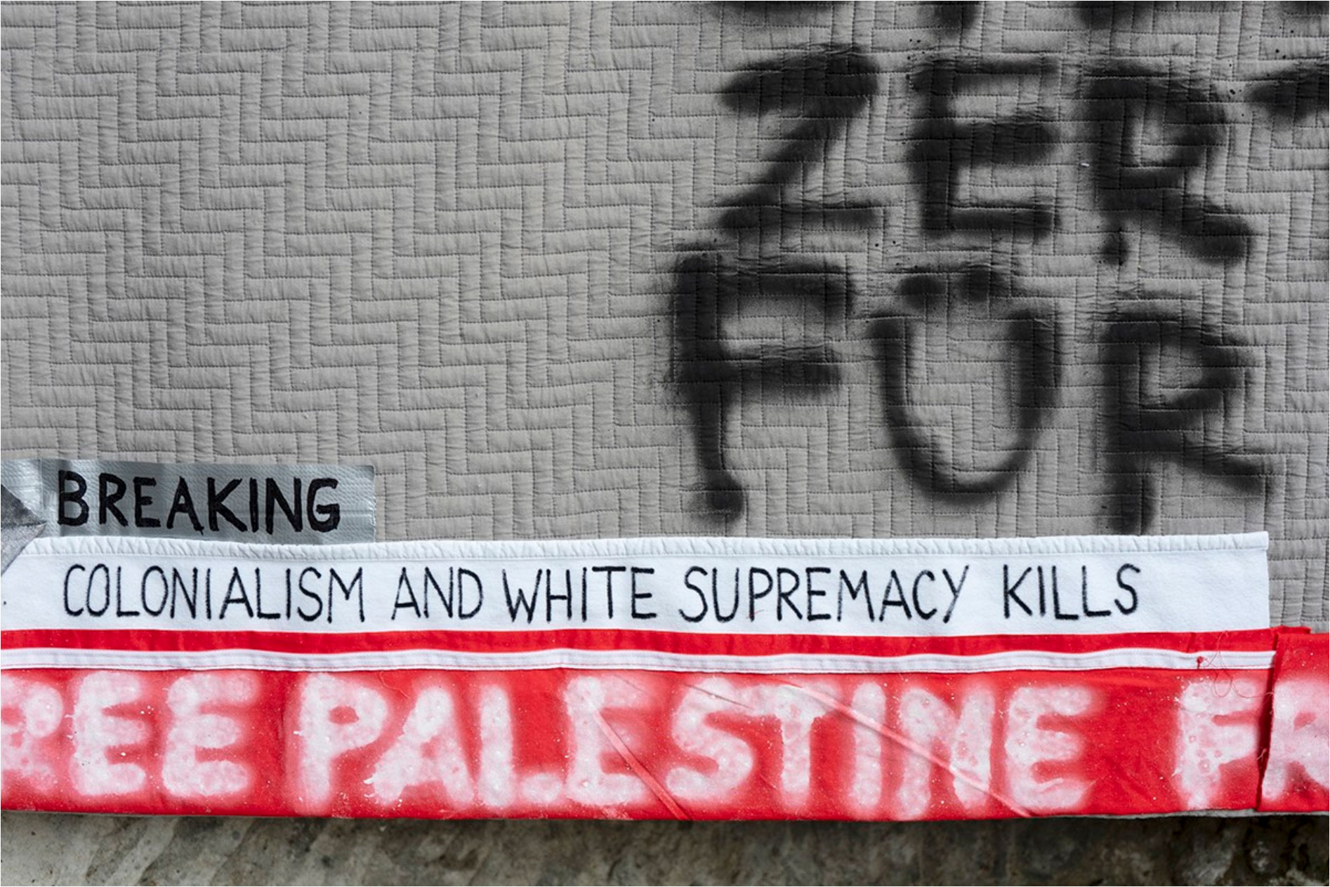 The textile banner as a medium of protest and to make messages heard on the street merges with the mainstream news by adopting its graphic layout. This work addresses the urgency of the current geopolitical conflicts and genocide and questions the role and reliability that the media plays in this.