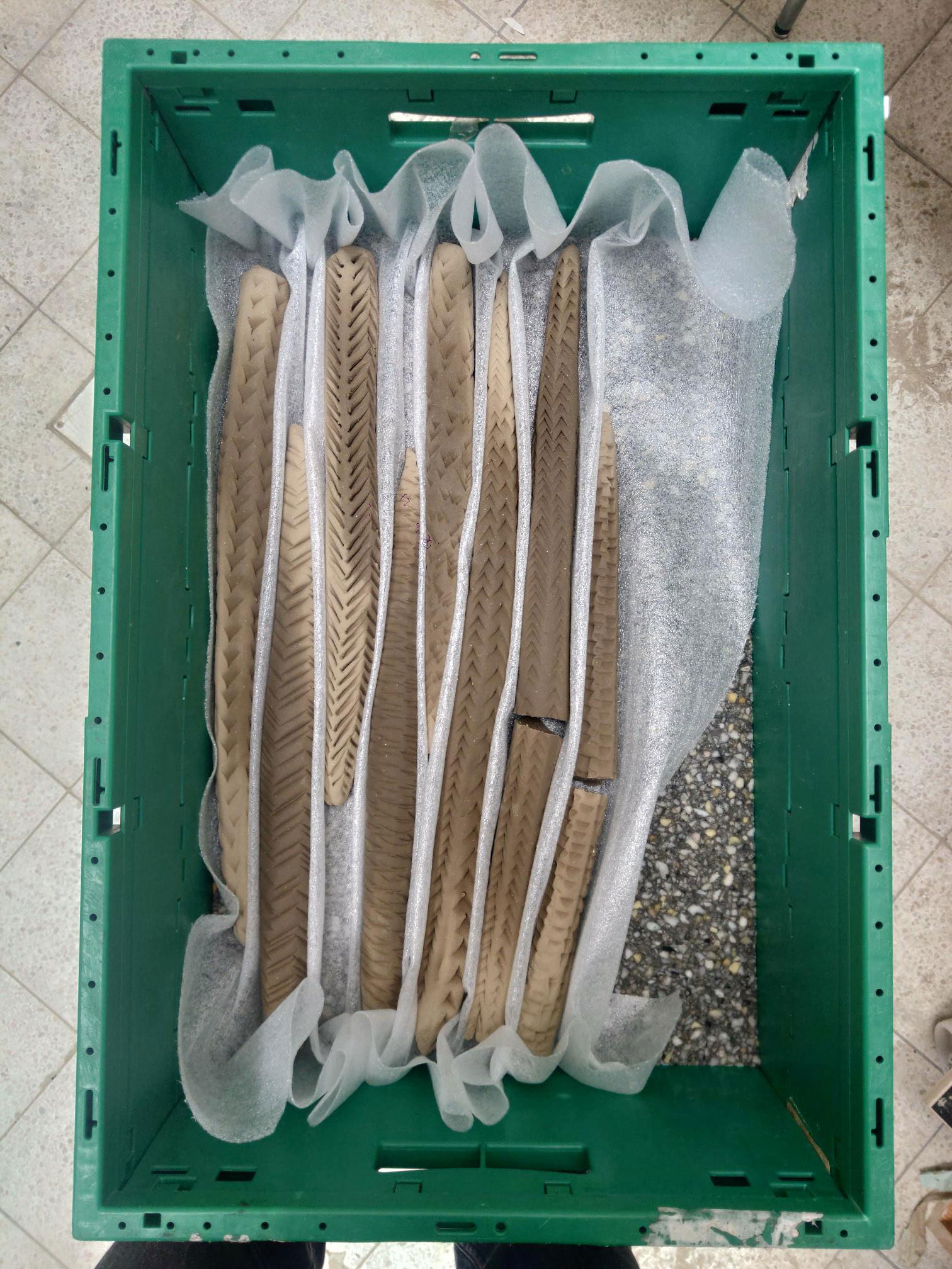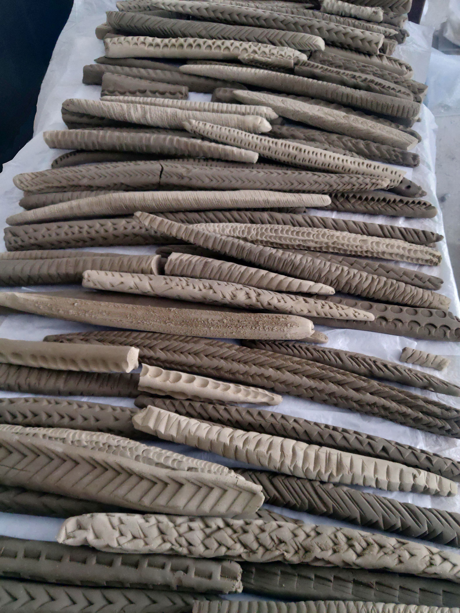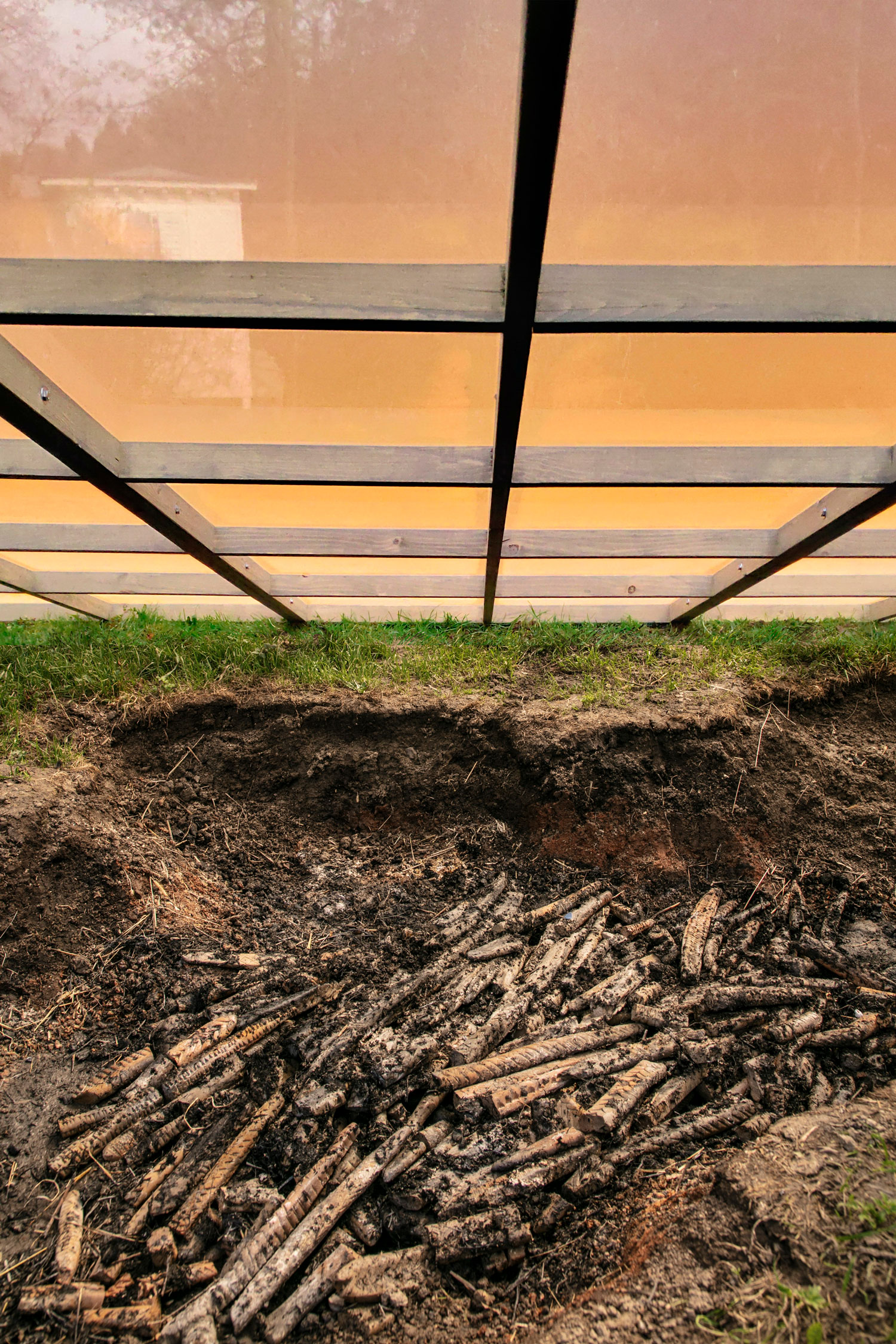 Ceramic objects were moulded from local earth out of the very pit where they were fired afterwards in a traditional field firing technique. The pieces have small notches and ornamental patterns on their surface, reminiscent of scales or individual vertebrae, of fossilised plants or even the tip of an arrow. The arrangement remained untouched after the process and is presented as an excavation, covered and protected by a grid structure that references archeological measuring instruments. The orange roof creates an artificial atmosphere on the scene,