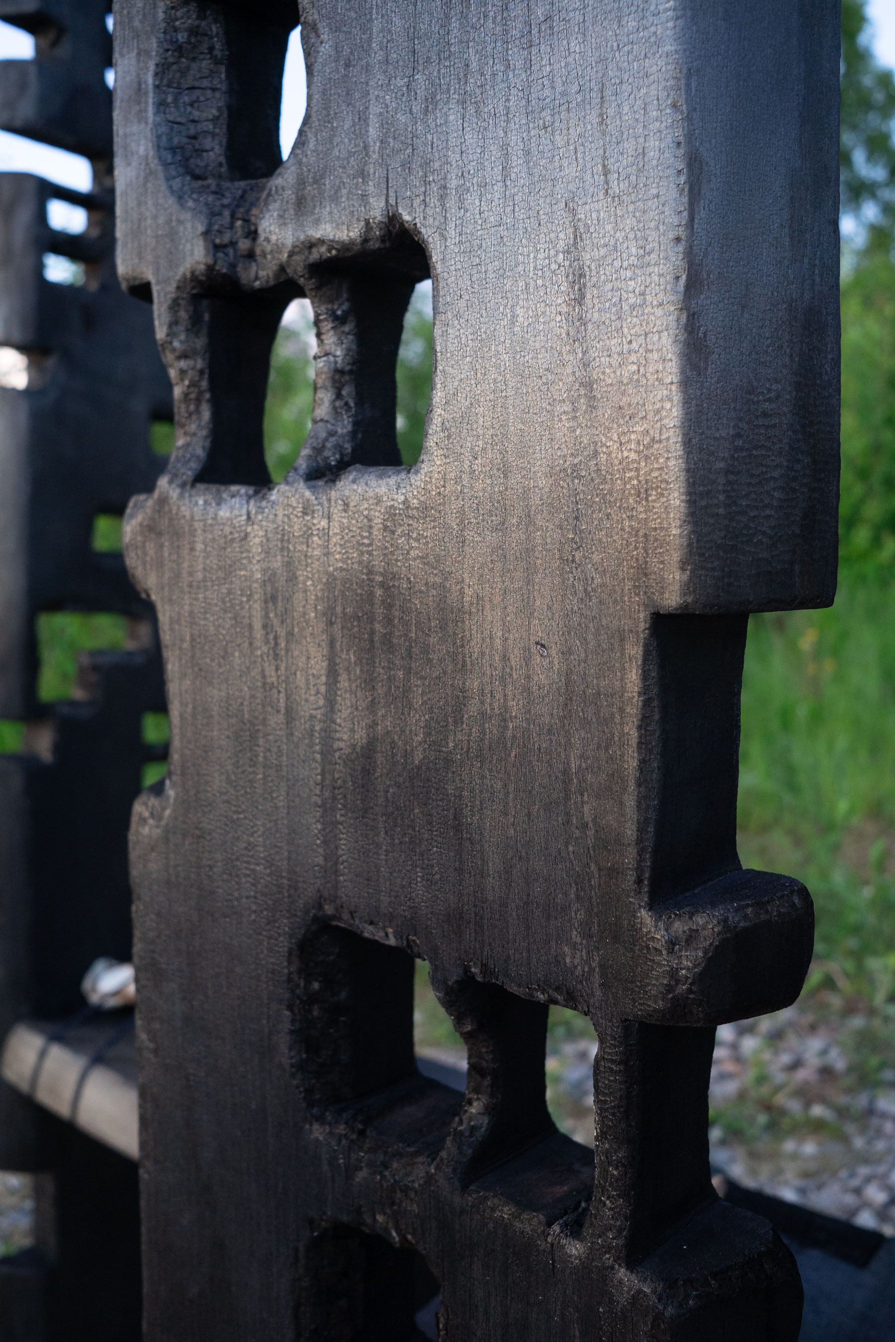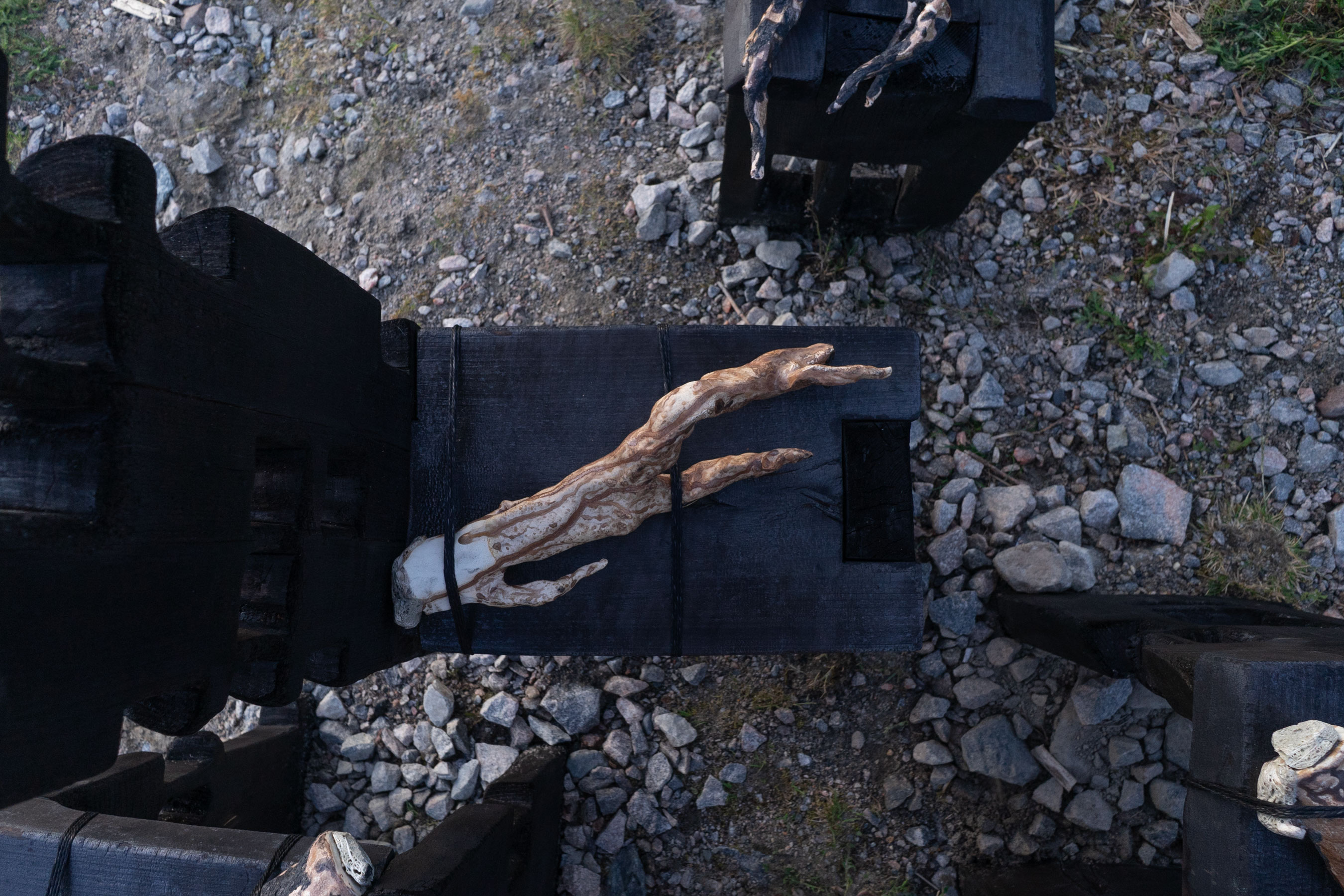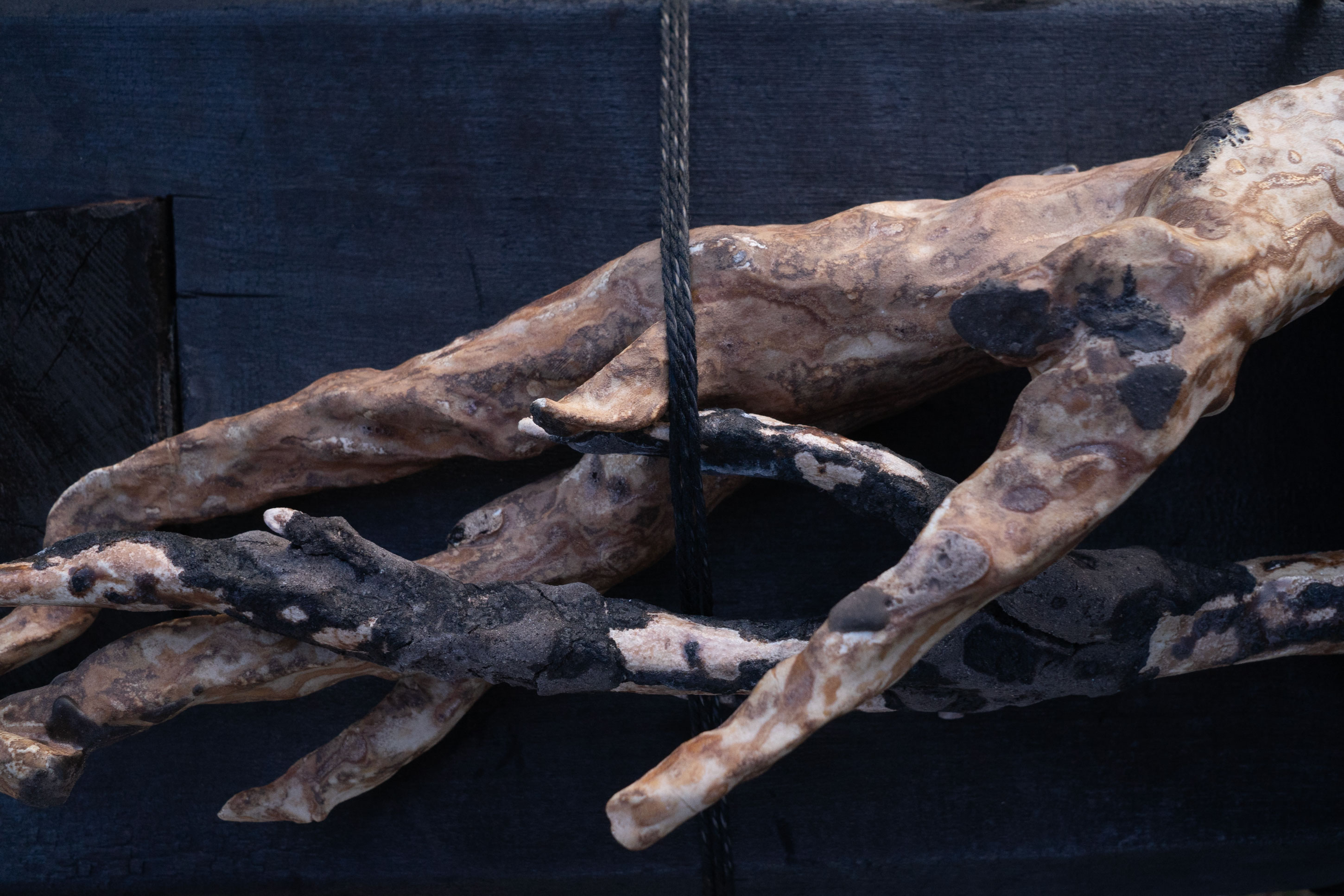 Placed on burned wooden chairs which outline architectural structures in ruins, the roots symbolize the connection to the grounds, ancient knowledge and the invisible thereby juxtapose to the sky-scraping anthropocentric ambition to govern and control earth.
