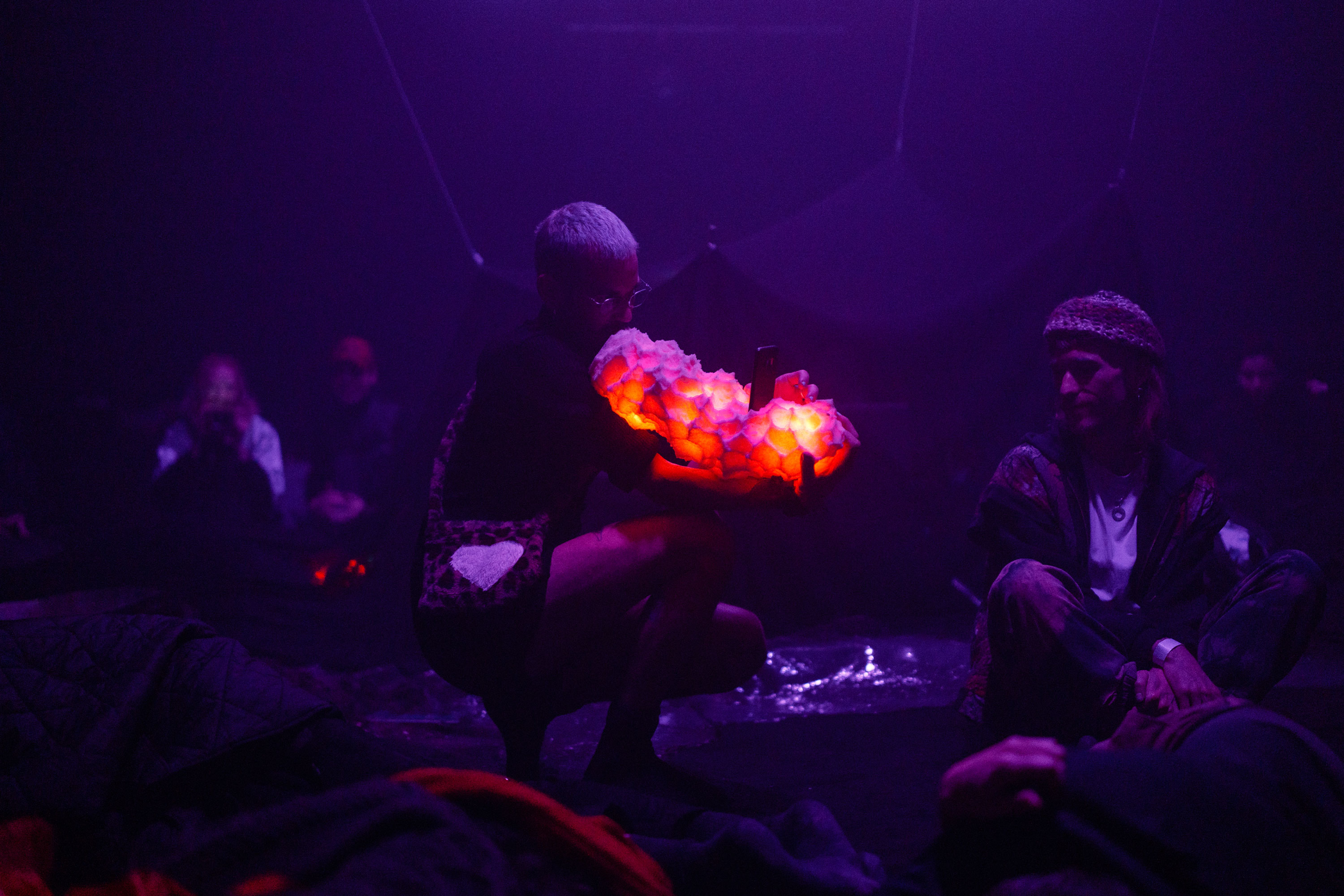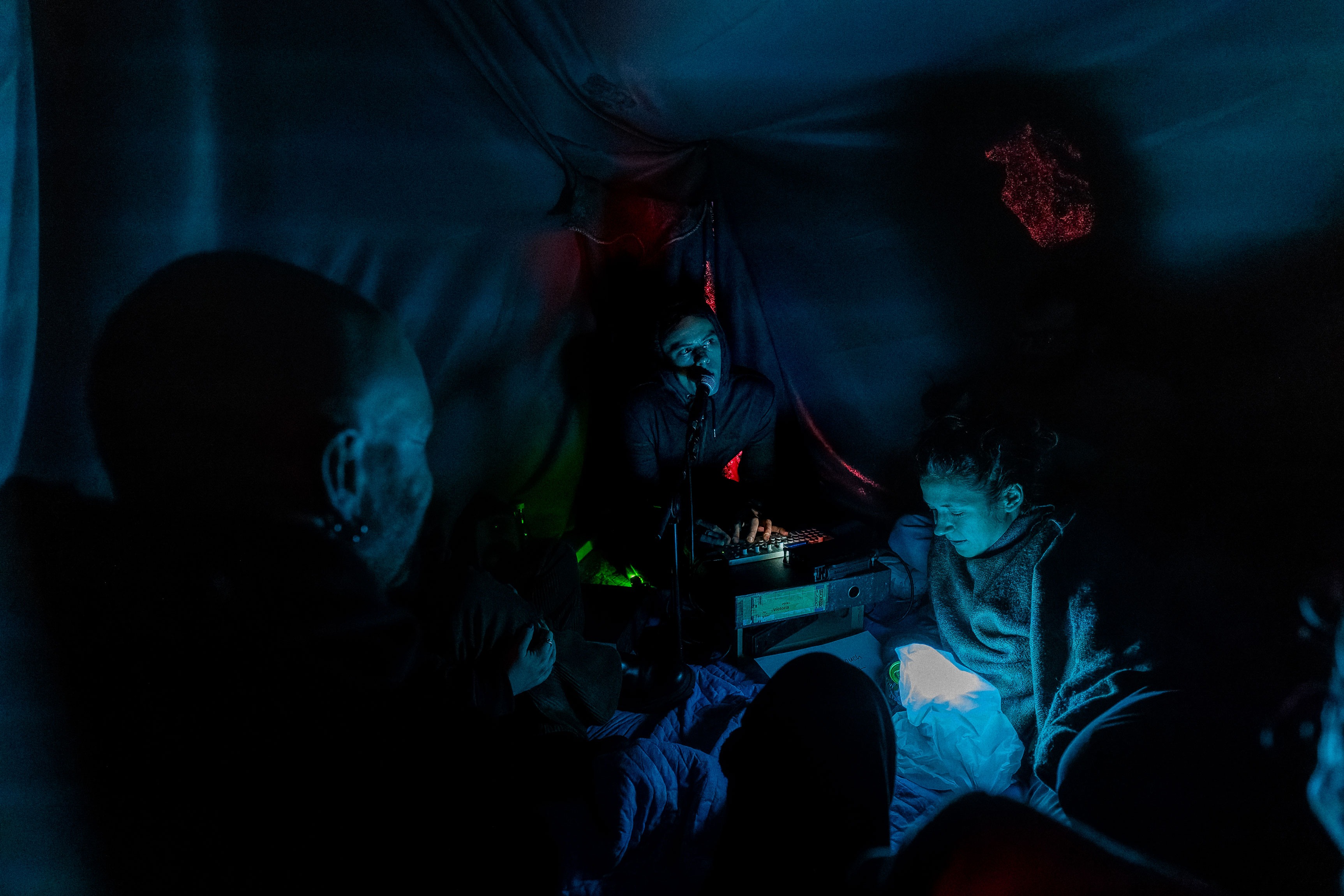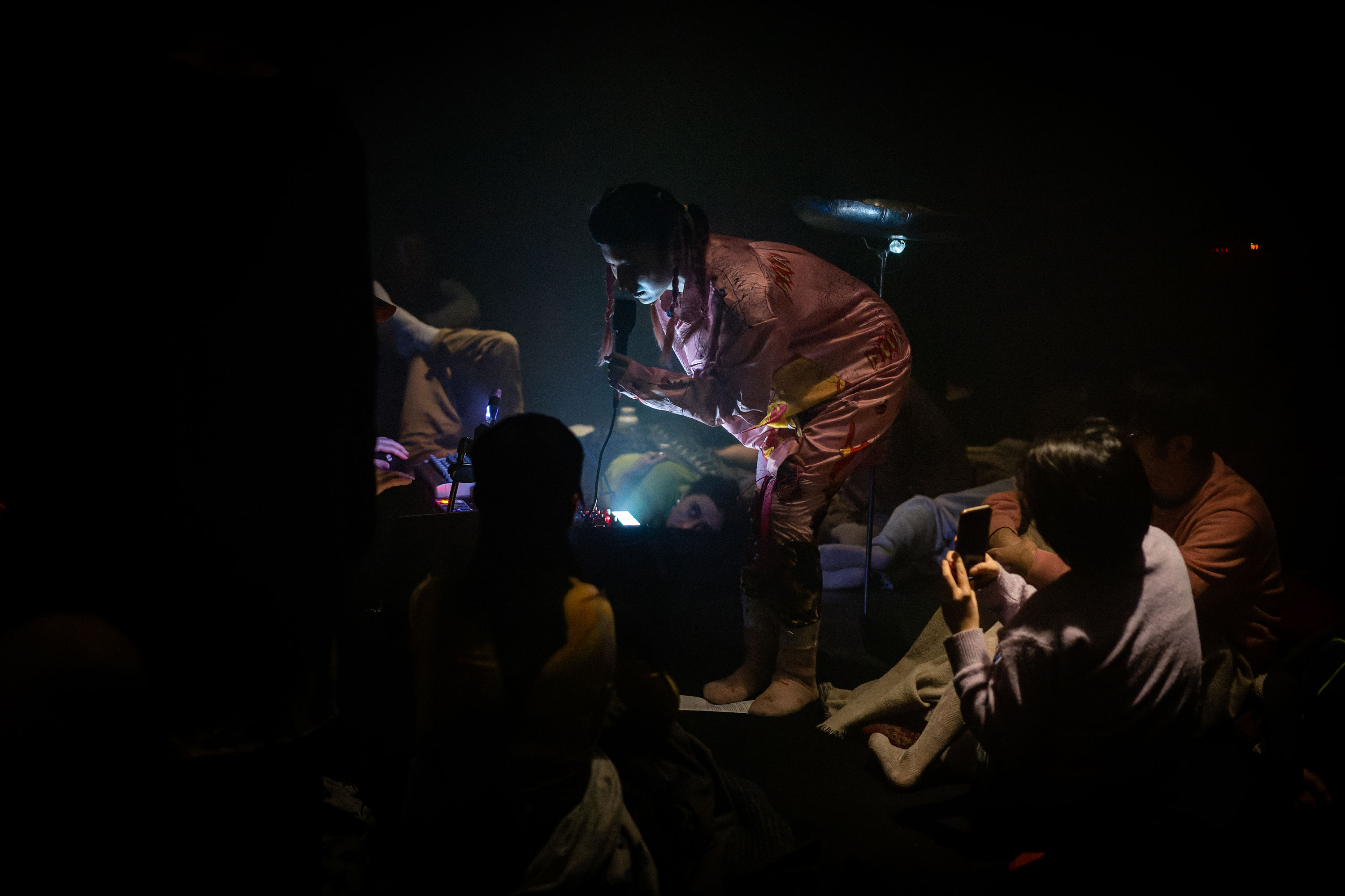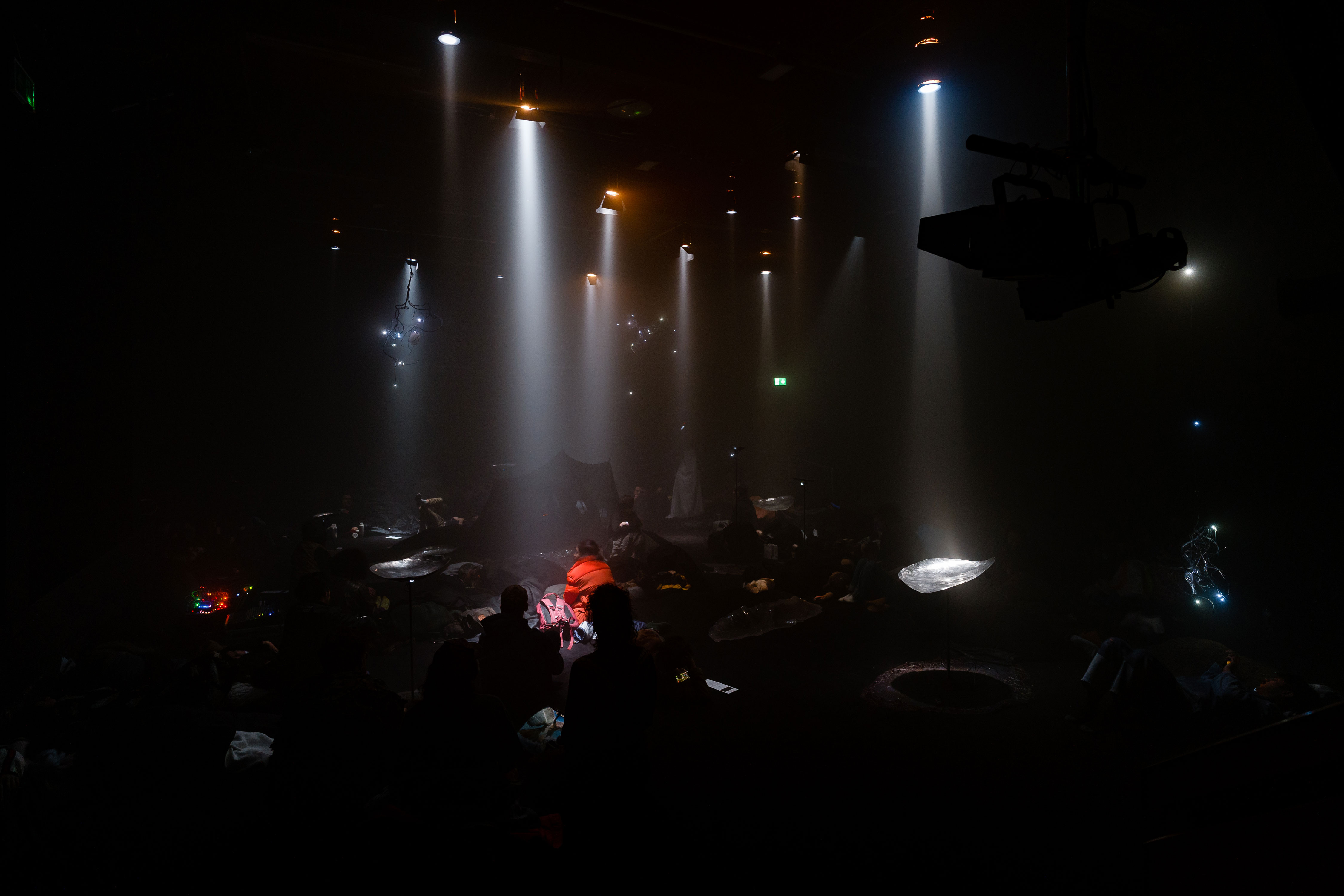 Here was activated by an opening sound performance by Yen Chun Lin and Lou Drago on Sunday 27 November. From 10pm on Saturday 3 December until 6am on Sunday 4 December, audiences are invited to spend the night in the installation. Over eight hours, the event included sound works featuring inaudible frequencies, sleep-inducing rhythms, dream echoes, lullabies of nightmares, shimmers of darkness, nocturnal wanders, and bedtime tales.